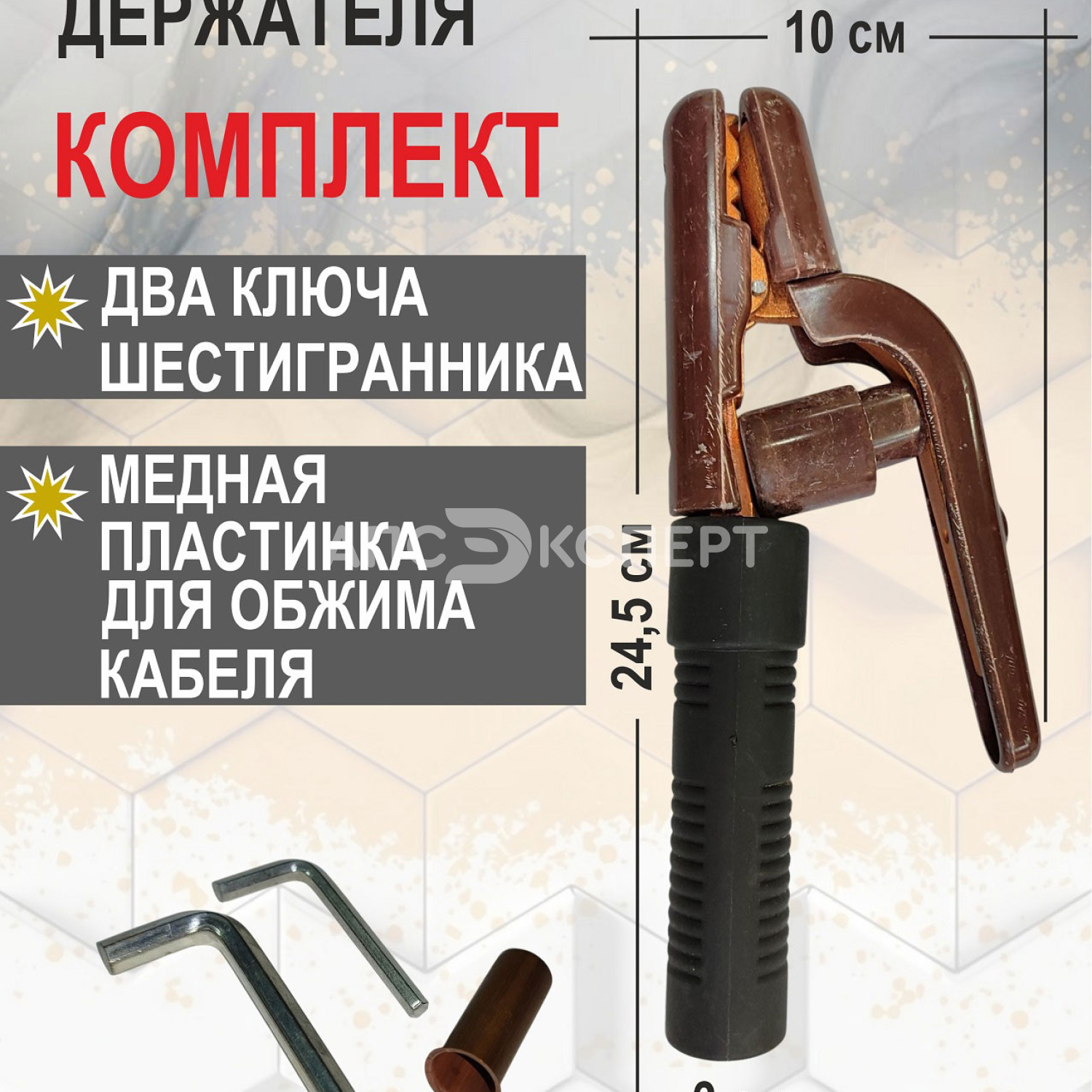 Сварочный электрододержатель на 300А — это профессиональный инструмент для ручной дуговой сварки (ММА), предназначенный для надежной фиксации электродов диаметром 2.0-5.0 мм и подвода сварочного тока силой до 300 А. Изготовлен из высококачественной токопроводящей медной композитной стали, что обеспечивает минимальное падение напряжения и эффективное теплорассеивание.